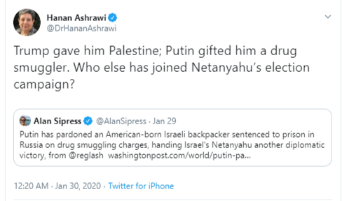 Issachar is not a politician. She is just a naive, perhaps stupid, girl for taking the marihuana on the plane. But Ashrawi, by smearing her as a "drug smuggler," shows that she does not want to merely insult a girl - but an Israeli and a Jew. She wants to tell the world that Issachar is guilty because she is Jewish - there is no other evidence of her being a smuggler.